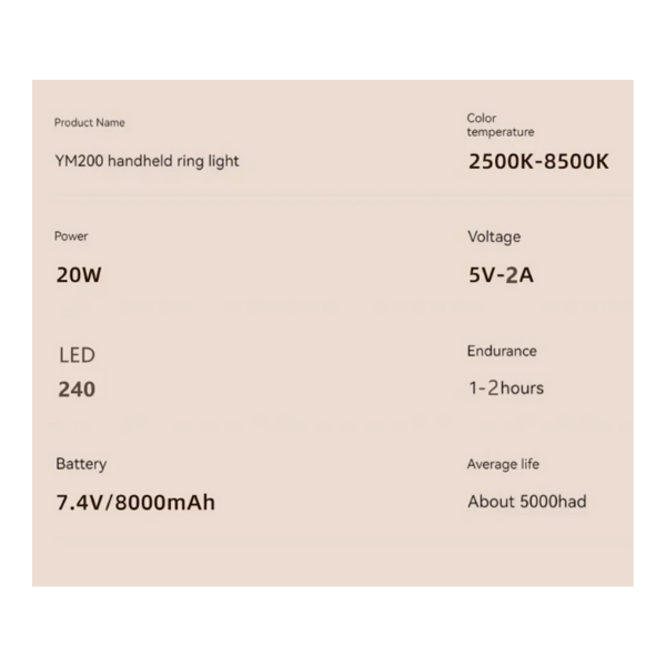 USB and 2A battery connectivity for this rectangular selfie handheld ring light comes with phone holder. 5V, adjustable 2500K-8500K at 20W